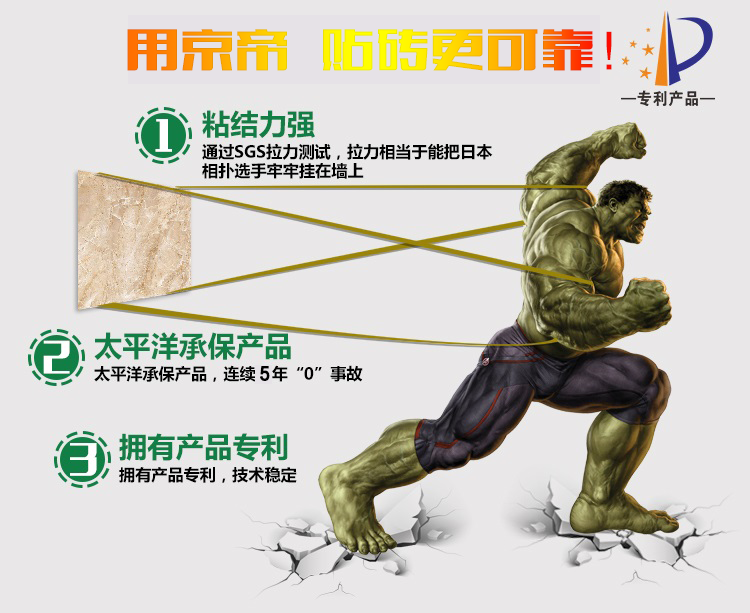 因此,要解决瓷砖背胶的粘结力问题,就要解决老化问题。而由京帝科技新材料有限公司所研发推出的膏状瓷砖背胶,则与实验中的乳液型背胶完全不同,这玩意儿完全不粘手,看上去不像能粘住什么的样子。但它却能通过背胶中的高分子聚合物连接水泥砂浆分子和瓷砖表面分子,使瓷砖背胶、水泥砂浆和瓷砖真正成为一个整体。与乳液状背胶仅仅与水泥砂浆和瓷砖发生表面粘结不同,正是因为使物体内部发生了变化,膏状背胶的耐老化性极好。老化实验数据显示,即使过了二十年,产品的粘结强度也只是下降了一点点。